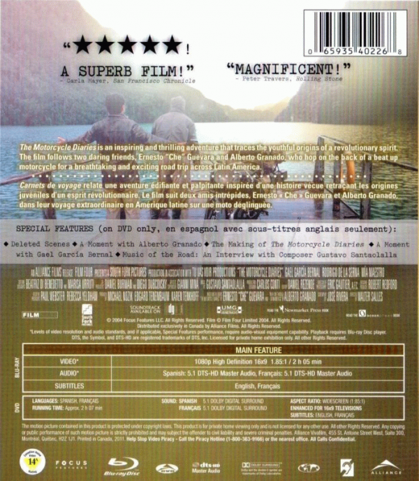 FilmSubtitle language: English, French Publication details: 2005Description: DVDGenre/Form: Online resources: Summary: The Motorcycle Diaries is an adaptation of a journal written by Ernesto "Che" Guevara de la Serna when he was 23 years old. He and his friend, Alberto Granado are typical college students who, seeking fun and adventure before graduation, decide to travel across Argentina, Chile, Peru, Colombia, and Venezuela in order to do their medical residency at a leper colony. Beginning as a buddy/road movie in which Ernesto and Alberto are looking for chicks, fun and adventure before they must grow up and have a more serious life. As is said in the film itself, it's about "two lives running parallel for a while." The two best friends start off with the same goals and aspirations, but by the time the film is over, it's clear what each man's destiny has become.