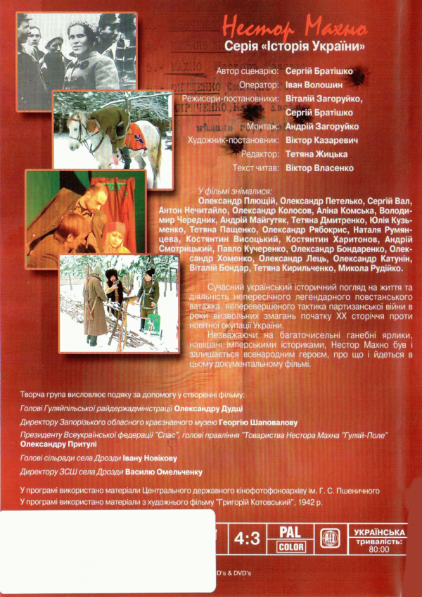 Nestor Ivanovych Makhno (Bat’ko Makhno) was a guerilla leader who led an independent anarchist army in Ukraine, and commanded a peasant Revolutionary Insurrectionary Army. He then turned to organizing the Free Territory of Ukraine, as an anarchist society. This DVD presents a contemporary Ukrainian historical view of the life and activities of this legendary insurgent leader and master of guerilla warfare during the struggle for independence (beginning of the 20th century). Despite the many shameful labels attributed to Makhno by imperial-minded historians, Makhno remains a popular folk hero. Historical Documentary
