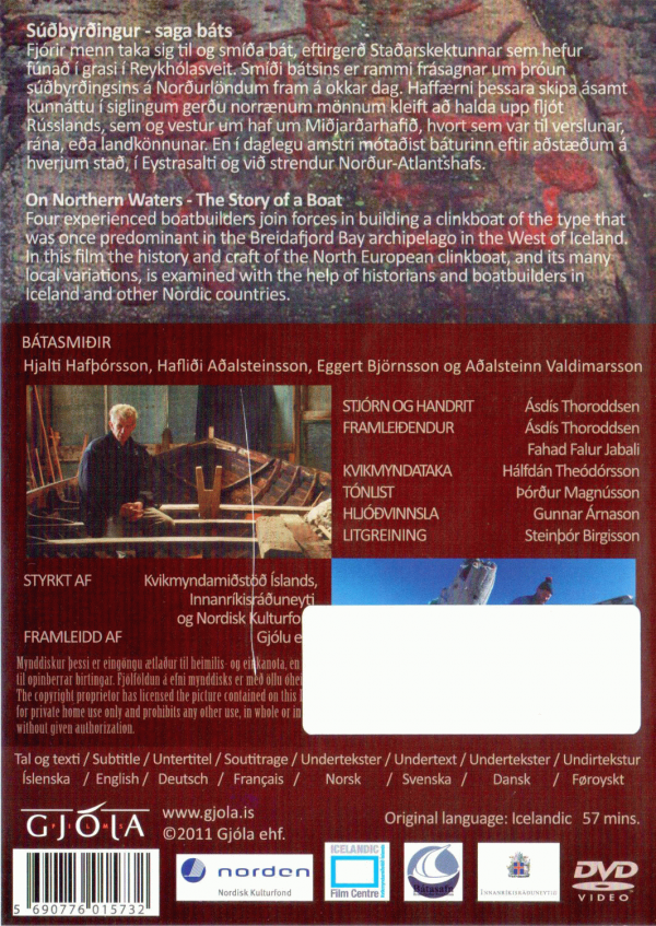 FilmSubtitle language: English, Icelandic, German, French, Norwegian, Swedish, Danish, Föroyskt Publication details: 2011Description: DVDGenre/Form: Online resources: Summary: Four experienced boatbuilders join forces in building a clinkboat of the type that was once predominant in the Breidafjord Bay archipelago in the West of Iceland. In this film this history and craft of the North European clinkboat, and its many local variations is examined with the help of historians and boatbuilders in Iceland and other Nordic countries.