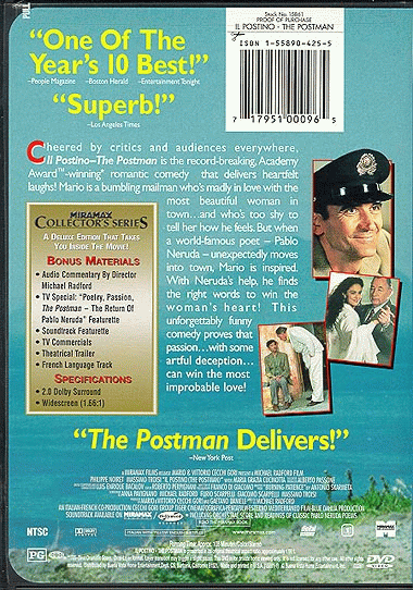 Simple Italian postman learns to love poetry while delivering mail to a famous poet; he uses this to woo local beauty Beatrice.