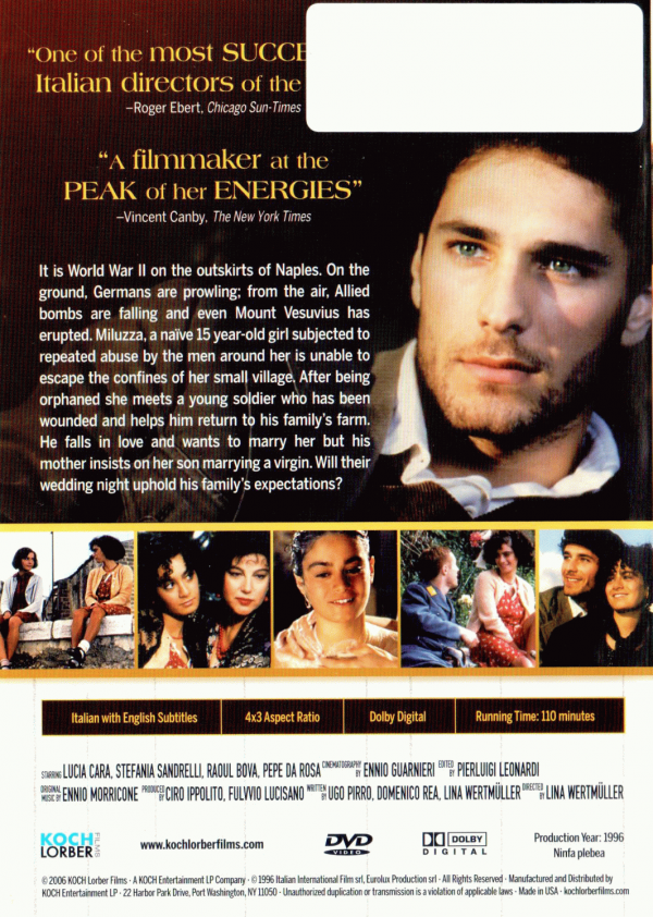 FilmSubtitle language: English Publication details: 1996Description: DVDGenre/Form: Online resources: Summary: A ripe 19-year-old virgin fights to keep her virtue and retain her free-spirited ways during WW II. Set in an ancient, remote Neapolitan village, Miluzza is the lovely pubescent daughter of the glorious Nunziata, a nymphomaniac who is surprisingly well tolerated by her husband and her normally conservative neighbors. Nunziata and Miluzza lead an idyllic life until the Allies bomb their village. During the shelling Nunziata is killed in a manner that would make Freud proud. Afterward, Miluzza gets work at a tomato sauce factory where the owner, enticed by an accidental peak at her underwear attempts to seduce her in a local hotel. With her reputation thus ruined, life for Miluzza becomes a struggle to fight the gossip mongers and those who would rape here until she encounters Pietro, a handsome wounded soldier who offers her a better life.