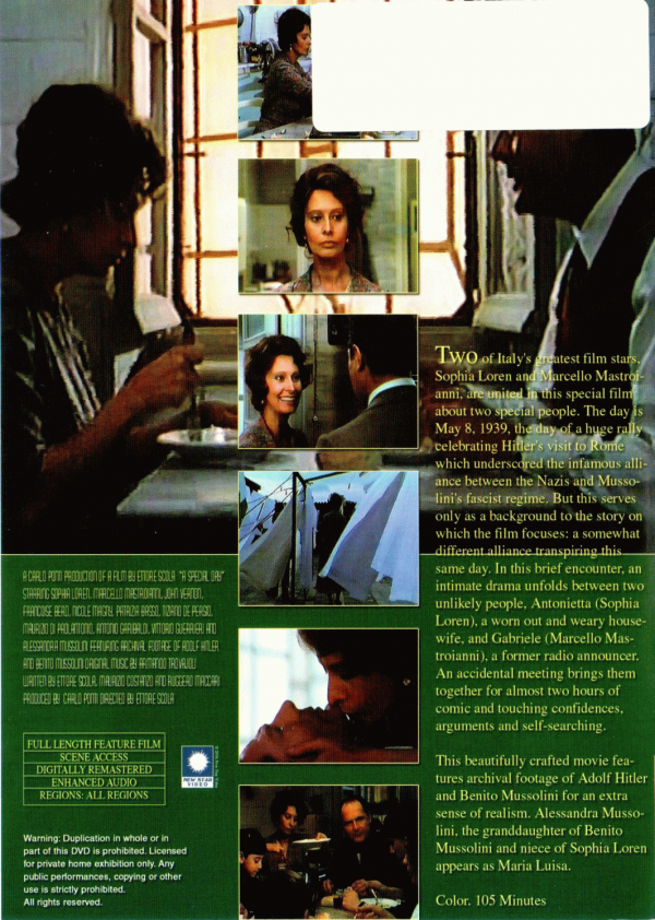 Film is in English The film is set during the late 1930s: the occasion is the first meeting between Mussolini and Hitler. Left alone in her tenement home when her fascist husband runs off to attend the historic event, Sophia Loren strikes up a friendship with her homosexual neighbor Mastroianni. As the day segues into night, Loreon and Mastroianni develop a very special relationship that will radically alter both of their outlooks on life.