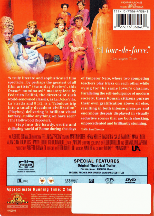FilmSubtitle language: English, French, Spanish Publication details: 1969Description: DVDGenre/Form: Online resources: Summary: In first century Rome, two student friends, Encolpio and Ascilto, argue about ownership of the boy Gitone, divide their belongings and split up. The boy, allowed to choose who he goes with, chooses Ascilto. Only a sudden earthquake saves Encolpio from suicide. We follow Encolpio through a series of adventures, where he is eventually reunited with Ascilto, and which culminates in them helping a man kidnap a hermaphrodite demi-god from a temple. The god dies, and as punishment Encolpio becomes impotent. We then follow them in search of a cure. The film is loosely based on the book Satyricon by Gaius Petronius Arbiter, the "Arbiter of Elegance" in the court of Nero. The book has only survived in fragments, and the film reflects this by being very fragmentary itself, even stopping in mid-sentence.