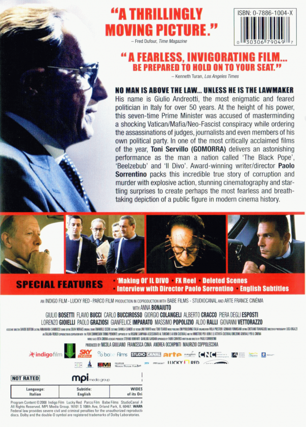 Winner of the Jury Award at the 2008 Cannes Film Festival, Il Divo is the controversial story of Guilio Andreotti (Toni Servillo). Calm, crafty, and inscrutable, Andreotti served seven terms as Italy s prime minister until the early 1990`s, when the world s most powerful Mafia declared war on him. Well-crafted and suspenseful, Il Divo is a story of politicking, corruption, scandal, and terrorism - and the man who sat through it all unscathed.