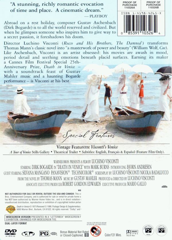 FilmSubtitle language: English, French, Spanish Publication details: 1971Description: DVDGenre/Form: Online resources: Summary: In this adaptation of the Thomas Mann novel, avant-garde composer Gustave Aschenbach (loosely based on Gustav Mahler) travels to a Venetian seaside resort in search of repose after a period of artistic and personal stress. But he finds no peace there, for he soon develops a troubling attraction to an adolescent boy, Tadzio, on vacation with his family. The boy embodies an ideal of beauty that Aschenbach has long sought and he becomes infatuated. However, the onset of a deadly pestilence threatens them both physically and represents the corruption that compromises and threatens all ideals.