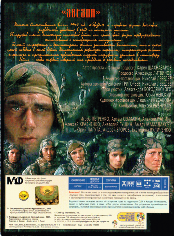 FilmPublication details: 2002Description: DVDGenre/Form: Online resources: Summary: During WW2 the Russian Army sent a special group named "Zvezda" to fight the Nazis in their backyard.