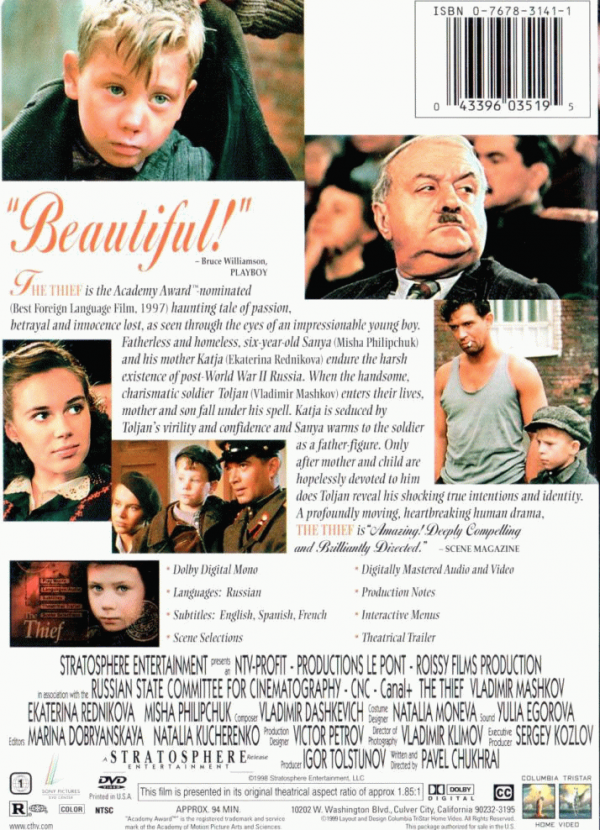 FilmSubtitle language: English, French, Spanish Publication details: 1997Description: DVDGenre/Form: Online resources: Summary: In 1946, a soldier fathers a child then dies before its birth. Jump to 1952: on a train, the child and his mother meet a handsome soldier who makes a play for her. She accepts. Posing as a married family, the soldier finds them a rooming house where he becomes everyone's favorite through his good looks and generosity. Meanwhile he gives the boy, Sanya, lessons in life: to fight back, to win at all costs. The child's mother, Katya, is head-over-heels in love with Tolyan, the soldier, but the relationship becomes rocky when Tolyan's true plans for the rooming house become clear. It starts them on a treadmill of flight that risks Katya's life, Tolyan's liberty, and Sanya's trust.