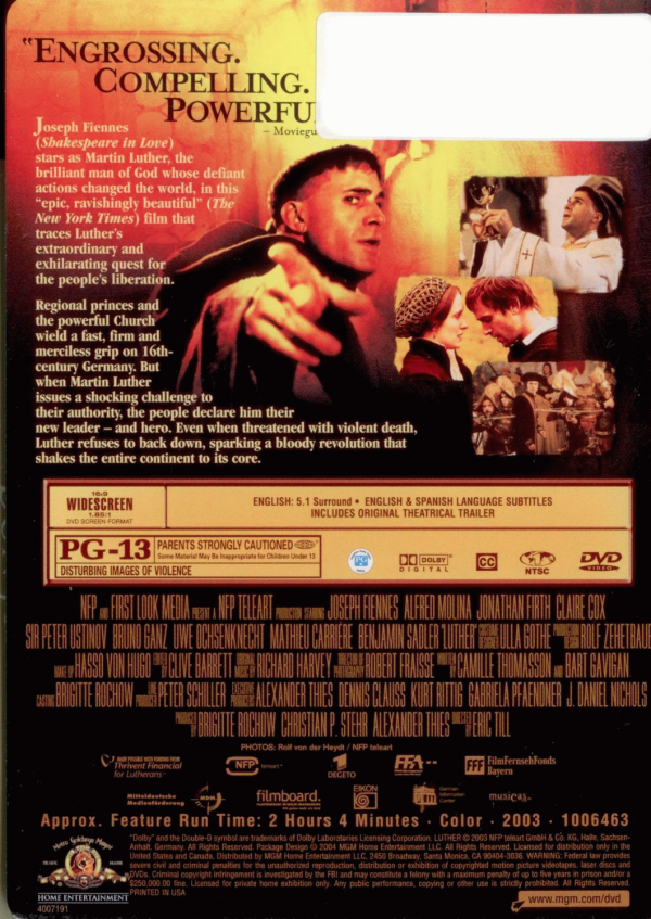 Armed with no more than his faith and quick wit, one man confronts the greatest powers on earth. Martin Luther's (Joseph Fiennes) bold actions foster an era of personal and religious freedoms unprecedented in history. A young law student, Luther abruptly enters a monastery when he believes his life is spared during a violent lightning storm. Luther proves an eager, apt disciple and is selected to travel to Rome on church business. He enters the holy city with the wide-eyed ideals of a young man -- only to have them shattered
