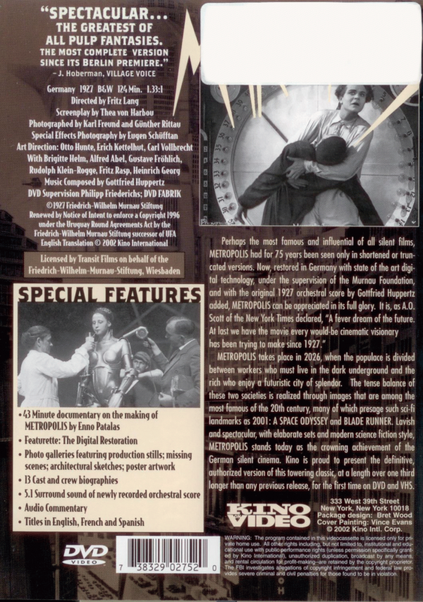 FilmSubtitle language: English, French, Spanish Publication details: 1927Description: DVDGenre/Form: Online resources: Summary: Sometime in the future, the city of Metropolis is home to a Utopian society where its wealthy residents live a carefree life. One of those is Freder Fredersen. One day, he spots a beautiful woman with a group of children, she and the children who quickly disappear. Trying to follow her, he, oblivious to such, is horrified to find an underground world of workers, apparently who run the machinery which keeps the above ground Utopian world functioning. One of the few people above ground who knows about the world below is Freder's father, Joh Fredersen, who is the founder and master of Metropolis. Freder learns that the woman is Maria, who espouses the need to join the "hands" - the workers - to the "head" - those in power above - by a mediator or the "heart". Freder wants to help the plight of the workers in the want for a better life. But when Joh learns of what Maria is espousing and that Freder is joining their cause... Black and White Film
