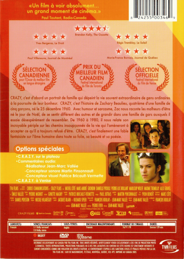 It's a story of two love affairs. A father's love for his five sons. And one son's love for his father, a love so strong it compels him to live a lie. That son is Zac Beaulieu, born on the 25th of December 1960, different from all his brothers, but desperate to fit in. During the next 20 years, life takes Zac on a surprising and unexpected journey that ultimately leads him to accept his true nature and, even more importantly, leads his father to love him for who he really is. A mystical fable about a modern-day Christ-like figure, "C.R.A.Z.Y" exudes the beauty, the poetry and the madness of the human spirit in all its contradictions.