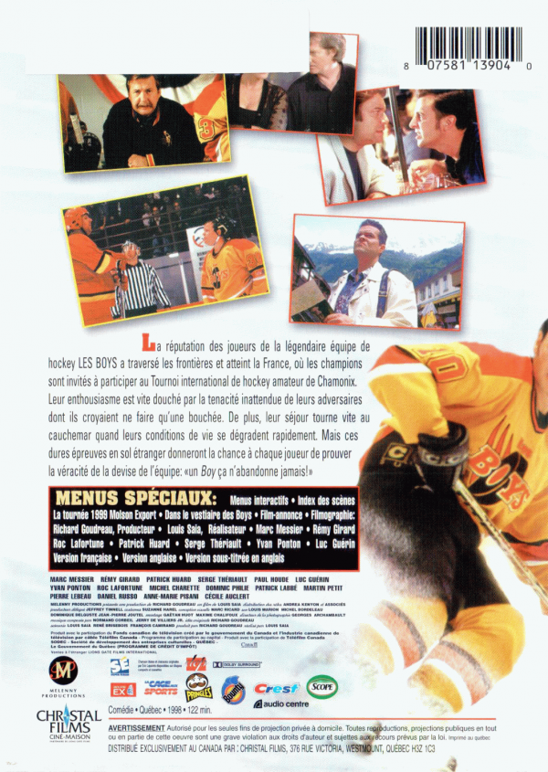 Canada's favorite cinematic hockey team returns in this slick, fast-paced comedy that features some of Quebec's most popular film and television stars. The film's 1997 predecessor grossed more money than any other French-Canadian film. The sequel begins as Les Boys, a championship amateur Montreal hockey team, flies to France to participate in an international competition in the alpine village of Chamonix. This time, rather than focusing on the team's on-ice hijinks, director Louis Saia spends the first part of the story on the characters as they attempt to cope with the cultural differences between themselves and the native French while also taking time to explore the romances between team lothario Bob and a local girl, and Coach Stan who involves himself with Violette, the owner of a local bistro. The on-ice action picks up when the tournament begins, and Les Boys promptly lose to a rag-tag West African team.