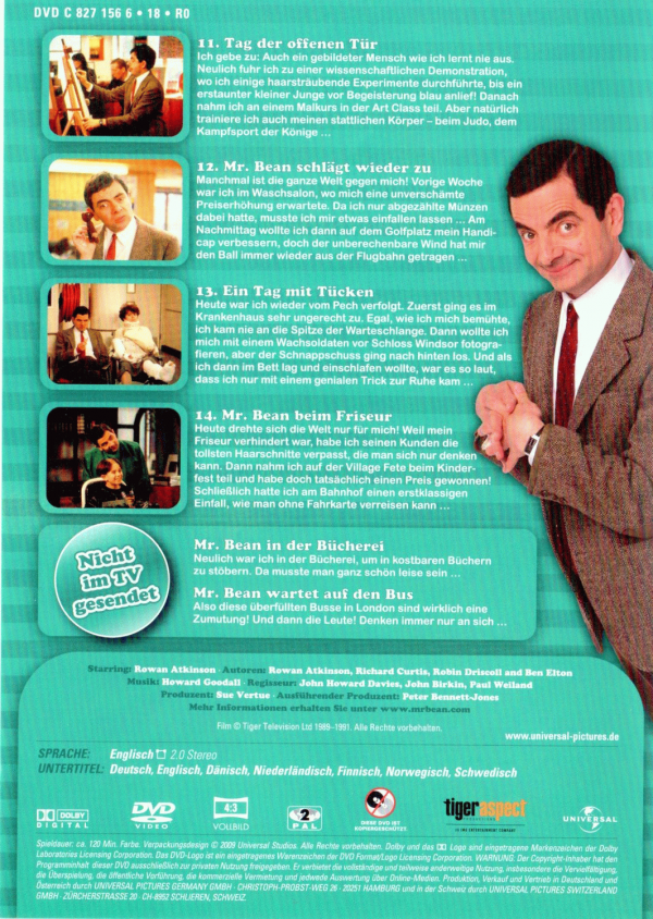 FilmSubtitle language: German, English, Danish, Finish, Norwegian, Dutch, Swedish Description: DVDGenre/Form: Online resources: Summary: 11. Tag der offenen Tür 12. Mr. Bean schlägt weider zu 13. Ein Tag mit Tücken 14. Mr. bean beim Friseur