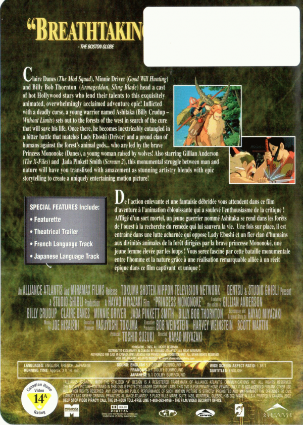 Claire Danes, Minnie Driver and Billy Bob Thorton head a cast of hot Hollywood stars who lend their talents to this exquisitely animated, overwhelmingly acclaimed adventure epic! Inflicted with a deadly curse, a young warrior named Ashitaka sets out to the forests of the west in search of the cure that will save his life. Once there, he becomes inextricably entangled in a bitter battle that matches Lady Eboshi and a proud clan of humans against the forest's animal gods... who are lead by the brave Princess Mononoke, a young woman raised by wolves! Also starring Gillian Anderson and Jada Pinkett Smith, this monumental struggle between man and nature will have you transfixed with amazement as stunning artistry blend with epic storytelling to create a uniquely entertaining motion picture! Languages: English, French, Japanese