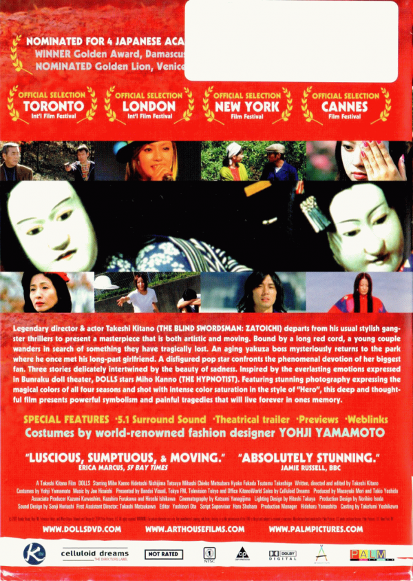 Kitano's extraordinary new film opens in the traditional bunraku doll theatre: the joruri singer and his shamisen accompanist perform the love-tragedy of Chubei, while the same story is acted out on the stage beside them by large puppets. The film proper cross-cuts between three more love-tragedies, set in an only slightly stylised version of present-day Japan. While paying a kind of homage to Chikamatsu, the doll theatre's greatest dramatist, Kitano sets out to create the exact reverse of bunraku: a selection of human emotional disasters as a doll might see them. Matsumoto jilts his lover Sawako to further his career; now he and Sawako roam Japan, despised and taunted, tied together forever by a red silk rope. Former star Haruna shuns the world after an accident leaves her disfigured; but her most devoted fan finds a way to meet her. And dying yakuza boss Hiro suddenly remembers the loyal girlfriend he abandoned 30 years ago. The stories span the four seasons and cover much of Japan. The tone is distinctively Kitano's, but the structure and primary-colour scheme are new (costumes: Yohji Yamamoto) and the sense of aesthetic adventure is palpable