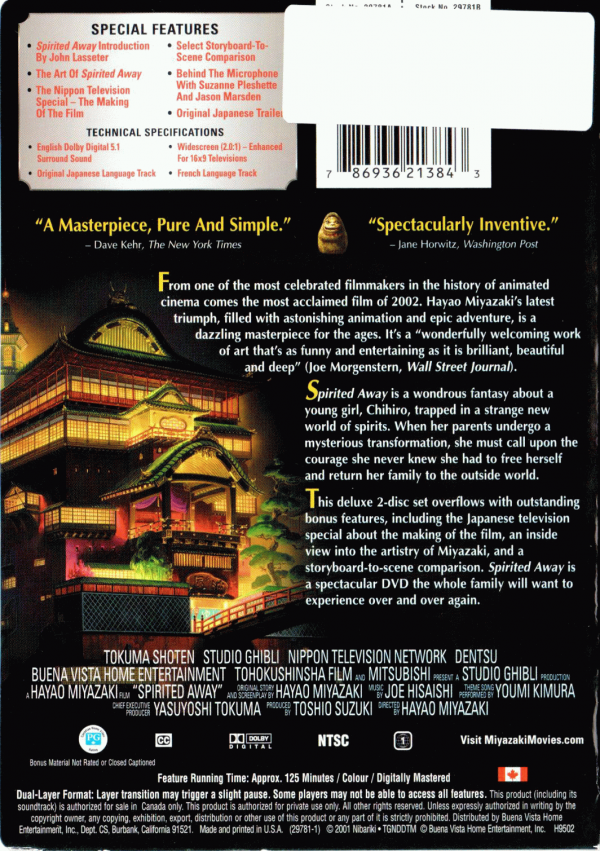 Directed by animation legend Hayao Miyazaki, SPIRITED AWAY is the tale of Chihiro (voiced by Daveigh Chase), a young girl who is taken down an unusual road by her parents while moving to a new home in an unfamiliar town. The curiosity of Chihiro's mother (Lauren Holly) and father (Michael Chiklis) leads the reluctant child into what appears to be an abandoned amusement park. Soon her parents are greedily feasting on various delights from an enticing food stand and are literally turned into pigs. The frightened and bewildered girl then encounters a young man named Haku (Jason Marsden), who explains what she must do to navigate this strange and magical realm. Finding employment in a bathhouse for spirits and other odd characters--including kimono-wearing frogs, lumbering tentacled monsters, and a mysterious apparition named No Face--Chihiro attempts to figure out how she can free her parents from the clutches of the resort's owner, a powerful witch named Yubaba (Suzanne Pleshette). In the process, she makes some very eccentric friends--and has to deal with some notoriously stinky customers.