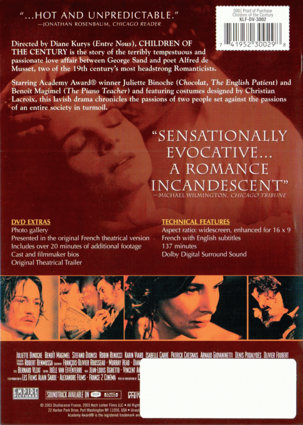 FilmSubtitle language: English Publication details: 1999Description: DVDGenre/Form: Online resources: Summary: True tale of the tumultuous love affair between two French literary icons of the 19th Century, novelist George Sand and poet Alfred de Musset. But their affair falls apart during an excursion to Venice, Italy where Musset is distracted by drugs and Sand by a handsome doctor.
