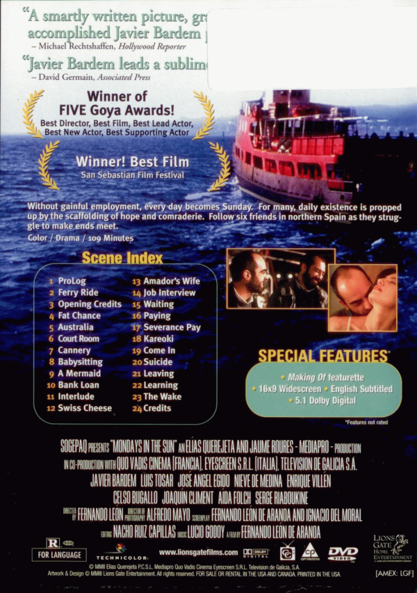 This is the story of those who live in a constant Sunday, those who spend Mondays under the Sun. The story of people who worked in a dockyard but now are unemployed. Elías Querejeta Producciones Cinematográficas S.L., Mediapro