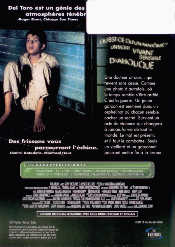 FilmSubtitle language: English, French Publication details: 2002Description: DVDGenre/Form: Online resources: Summary: Set in a school-turned-orphanage at the end of the Spanish Civil War, this film follows a rite-of-passage for ten-year-old Carlos (Tielve). Although the orphanage lies on a remote and dusty plateau far away from the frontline, the threat and dread of war is omnipresent. Carlos' life is hardly made easier by the bullying Jaime and the school's menacing janitor, Jacinto (Noriega). But things get even more threatening when Carlos begins seeing the pale specter of Santi, a fellow orphan who was brutally murdered shortly before his arrival.