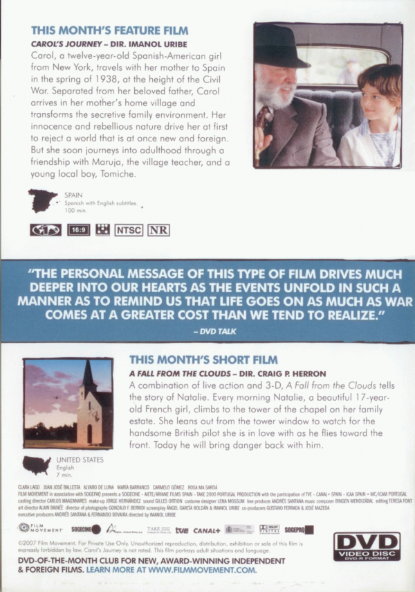 Carol, a twelve-year-old Spanish-American girl from New York, travels with her mother to Spain in the spring of 1938, at the height of the Civil War. Separated from her beloved father, Carol arrives in her mother's home village and transforms the secretive family environment. Her innocence and rebellious nature drive her at first to reject a world that is at once new and foreign. But she soon journeys into adulthood through a friendship with Maruja, the village teacher, and a young local boy, Tomiche.